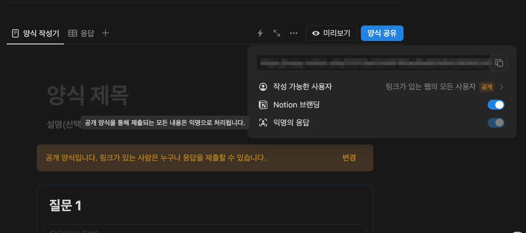 위에서 얘기한 것처럼, 공개가 되지 않은 페이지에 양식을 잘 위치시키셨나요? 이제 이 양식을 활용할 차례입니다. 양식의 우측 위에 있는 양식 공유 를 누르면 아래와 비슷한 화면을 보실 수 있습니다. 우피는 외부 공개용 페이지를 만드는 서비스인, 대부분의 경우 여러분들은 작성 가능한 사용자 옵션의 값이 링크가 있는 모든 사용자 일 것입니다. (그렇지 않으면, 여러분의 노션 워크스페이스에 가입한 사용자만 양식을 작성할 수 있을 테니까요)