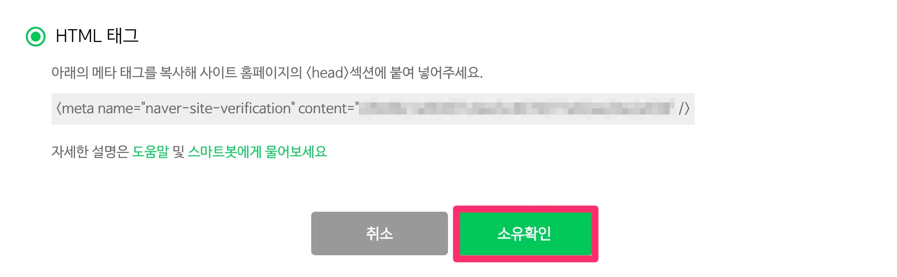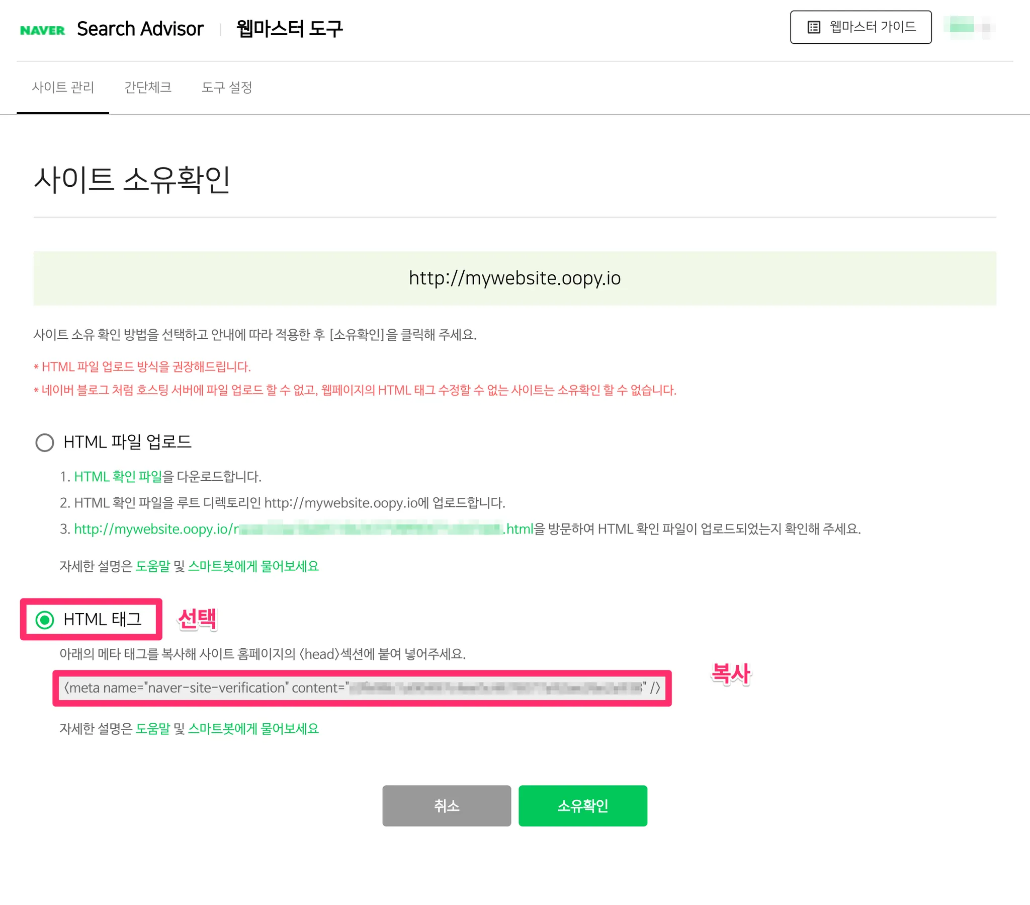 사이트 소유 확인을 위한 HTML 태그 복사
