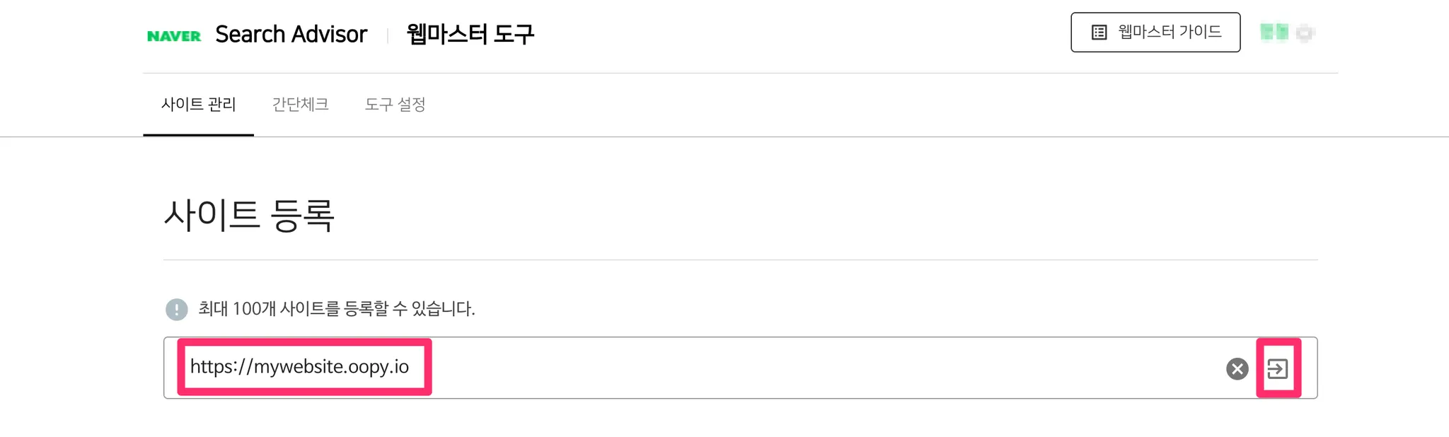 사이트 관리 에서 내 사이트를 등록하고 확인을 눌러주세요.