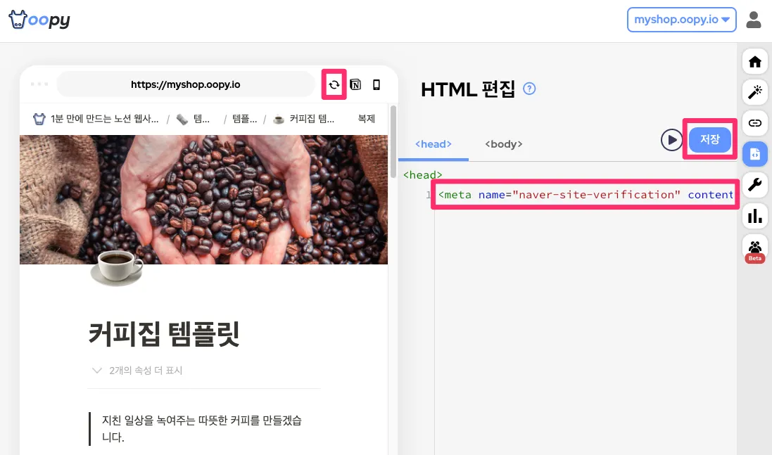 위 화면 순서대로 복사한 코드 붙여넣기 → 저장 → 새로고침 을 눌러주세요.