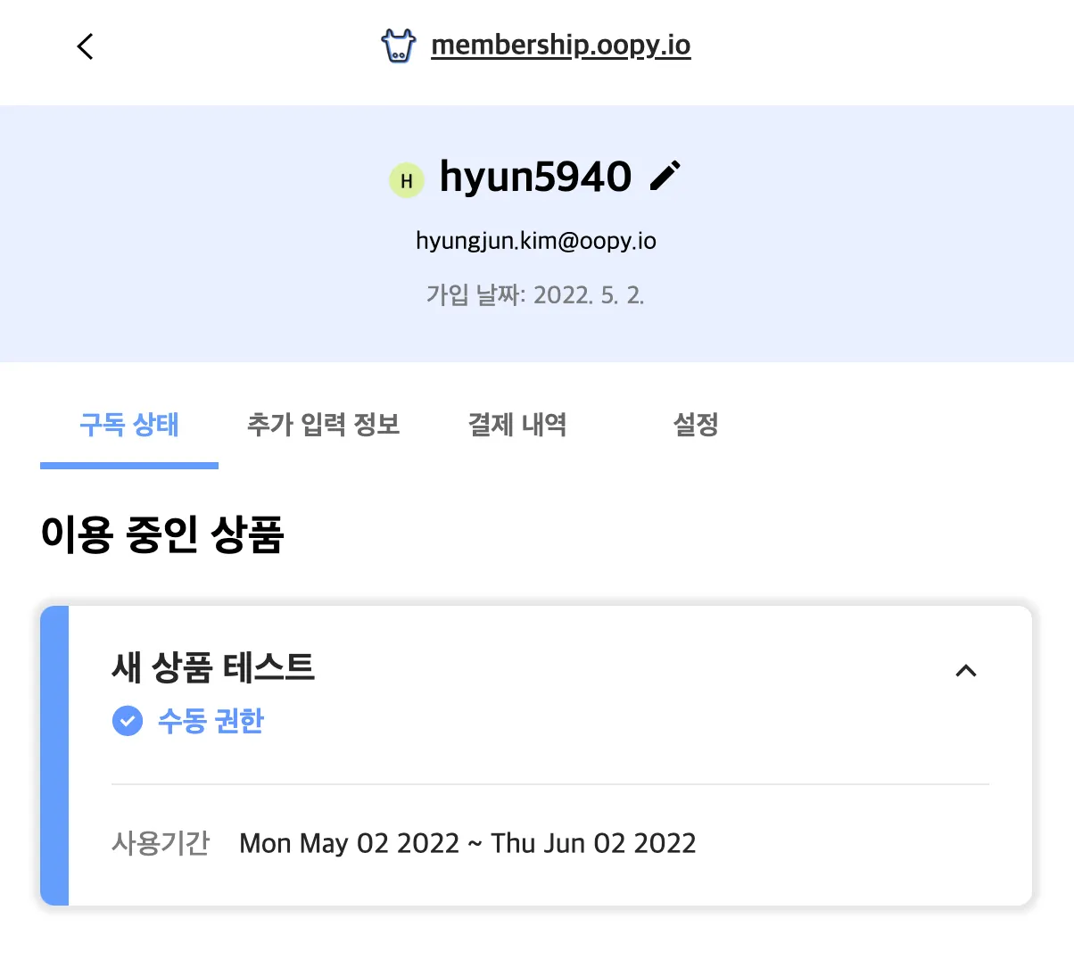 멤버는 마이페이지에서 아래와 같이 권한이 부여된 것을 확인할 수 있습니다.