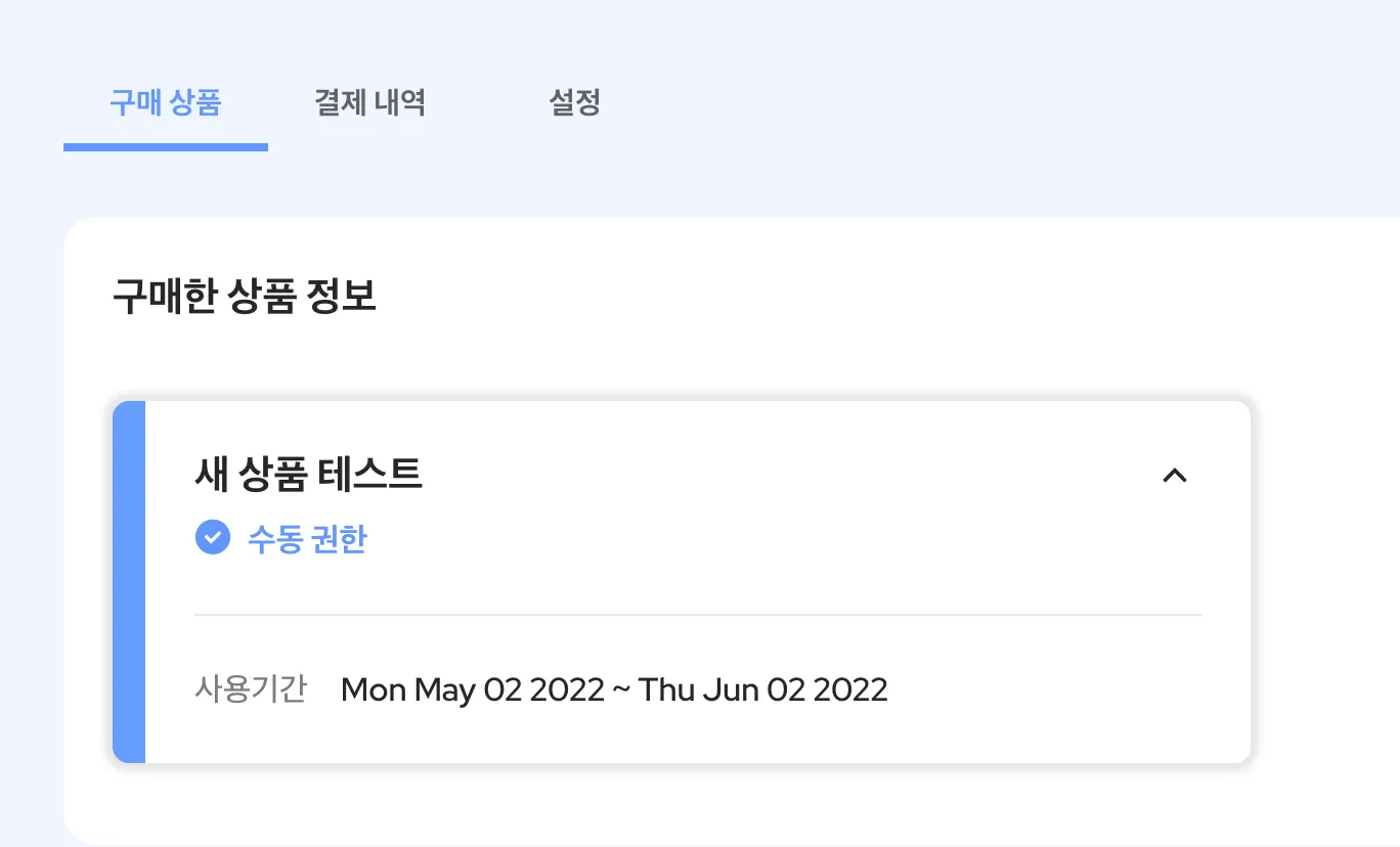 수동 권한 부여는 멤버가 상품을 구매하지 않아도 관리자가 직접 해당 상품의 권한을 부여할 수 있는 기능입니다. 프로모션 등의 목적으로 상품을 무료로 제공하거나, 구매가 불가능한 상품 권한을 멤버에게 부여할 때 사용할 수 있습니다.