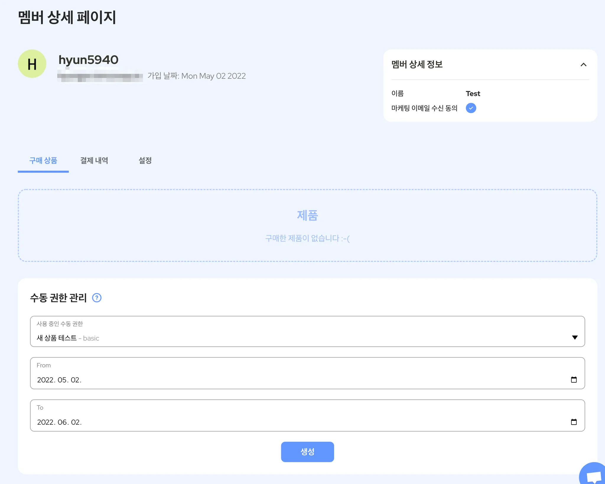 아래와 같이 멤버 상세 페이지가 나타나면 페이지 하단의 수동 권한 관리 메뉴로 이동하여서 이 멤버에게 부여할 상품을 선택하고 권한의 유효 기간을 선택해 주세요.