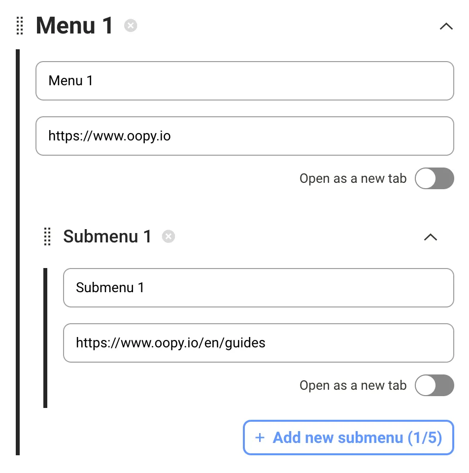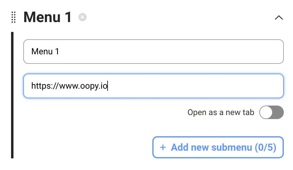 After click the button, you’ll find the menu card like right. You can edit the menu name, menu link and open as a new tab option.