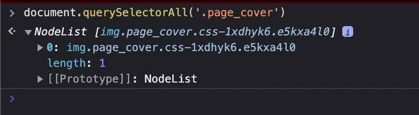 html 문서를 살펴보면, 해당 이미지가 page_cover 라는 css class 를 가진 것을 확인할 수 있습니다. 따라서 가장 간단하게는 해당 class 를 통해 페이지 커버를 선택할 수 있습니다. 해당 class 가 정말 우리가 원하는 페이지 커버만을 선택하는 지는 개발자 도구를 통해서 확인할 수 있습니다.