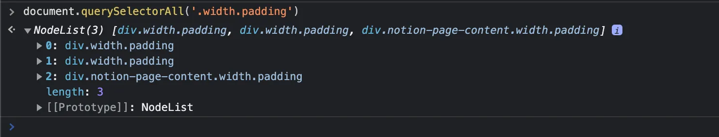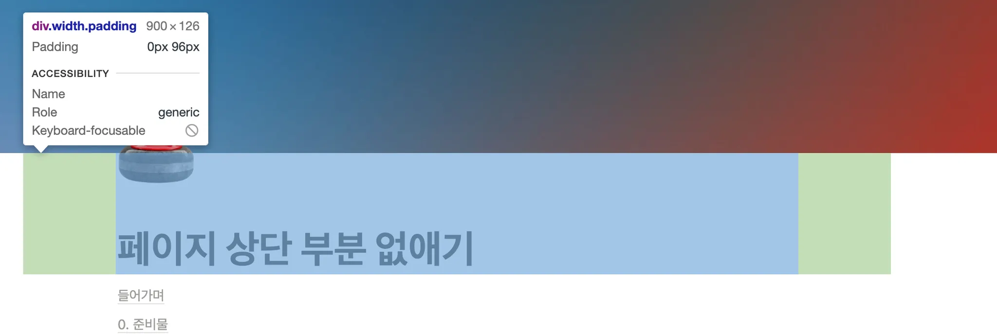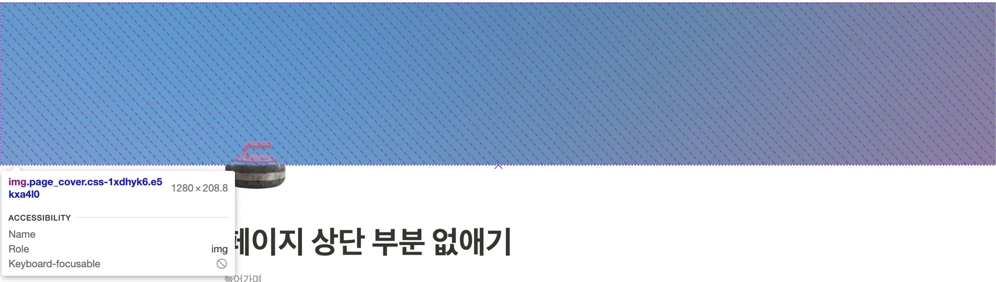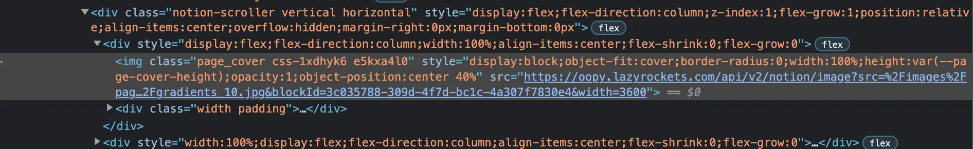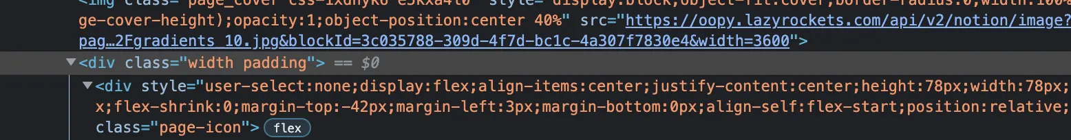 html 문서를 살펴보면, 해당 부분이 width와 padding이라는 css class 를 가진 것을 확인할 수 있습니다. 따라서 가장 간단하게는 해당 class 들을 통해 페이지 상단 영역을 선택할 수 있습니다. 해당 class 가 정말 우리가 원하는 페이지 커버만을 선택하는 지는 개발자 도구를 통해서 확인할 수 있습니다.