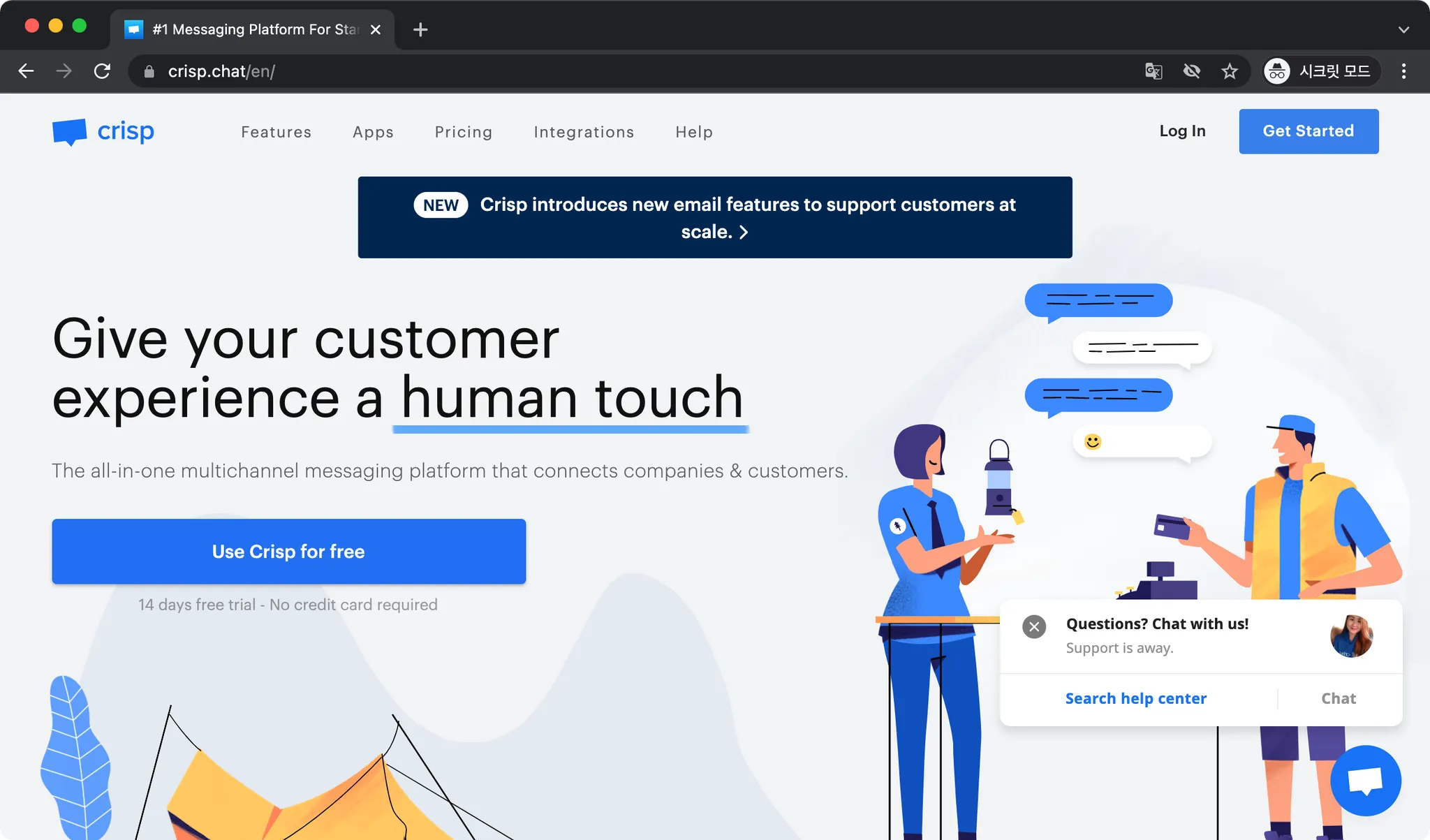 Crisp은 해외에서 운영되는 메세징 서비스입니다. 무료 사용자를 위한 Basic 플랜이 있기 때문에 페이지 방문자 수가 많지 않을 때 사용하기 적합합니다.