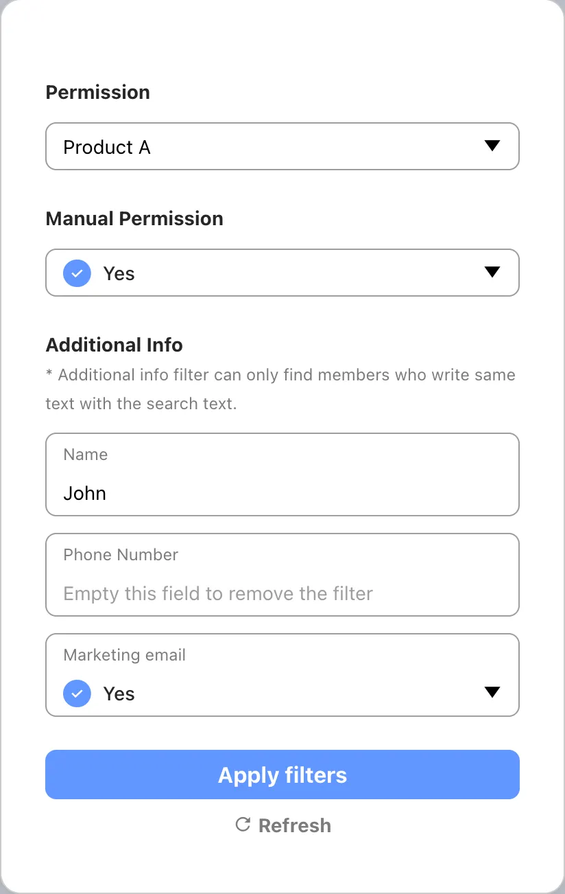 You must enter exactly same value when use additional info filters. For example, if a member enters the โNameโ field as โJohnโ and you want find that person, you must enter โJohnโ, not โJoโ or โJohโ.