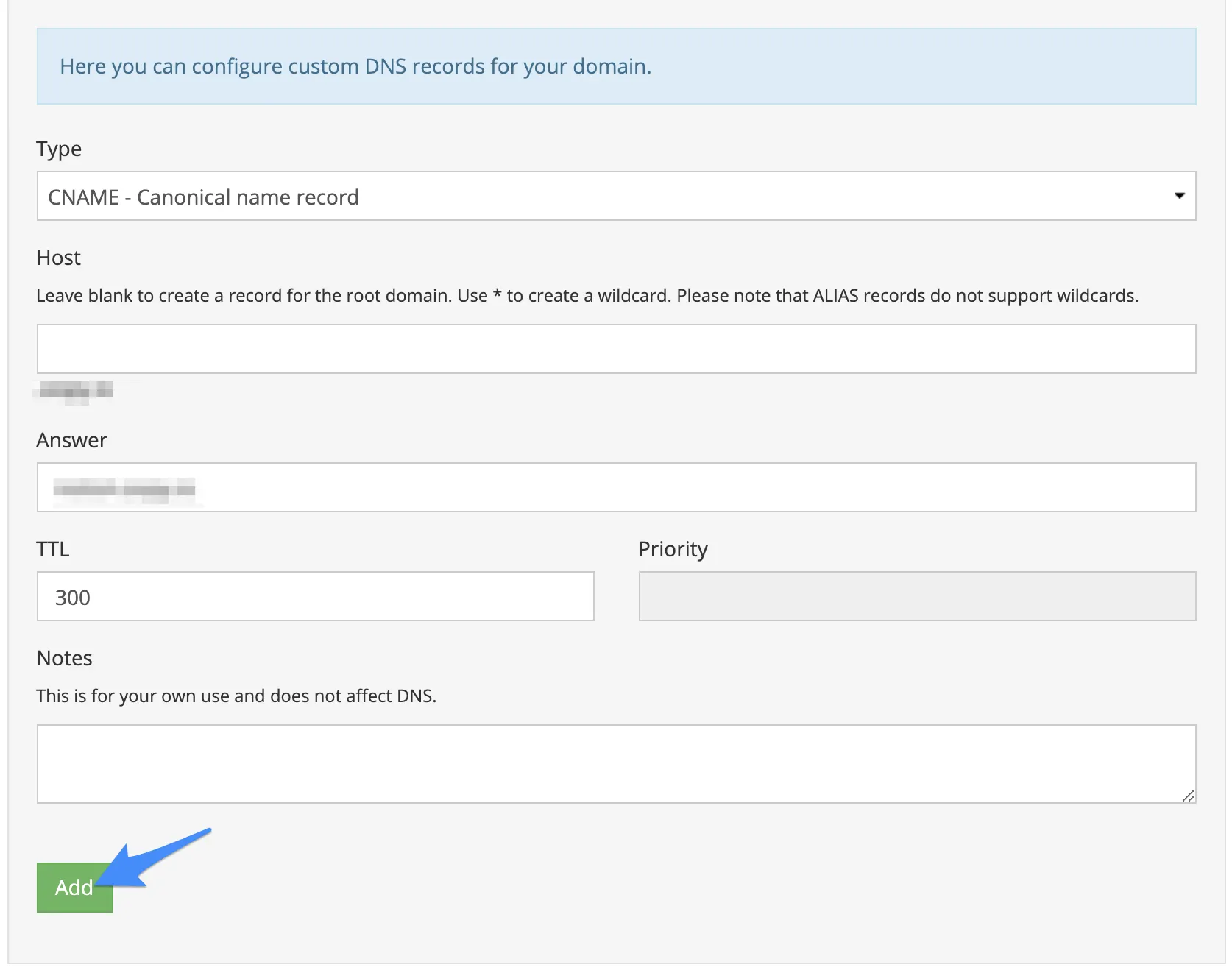 Host 에는 원하는 값을(예를 들면 www), Answer 에는 notion2.oopy.io를 입력해주세요. Add를 눌러 주세요.