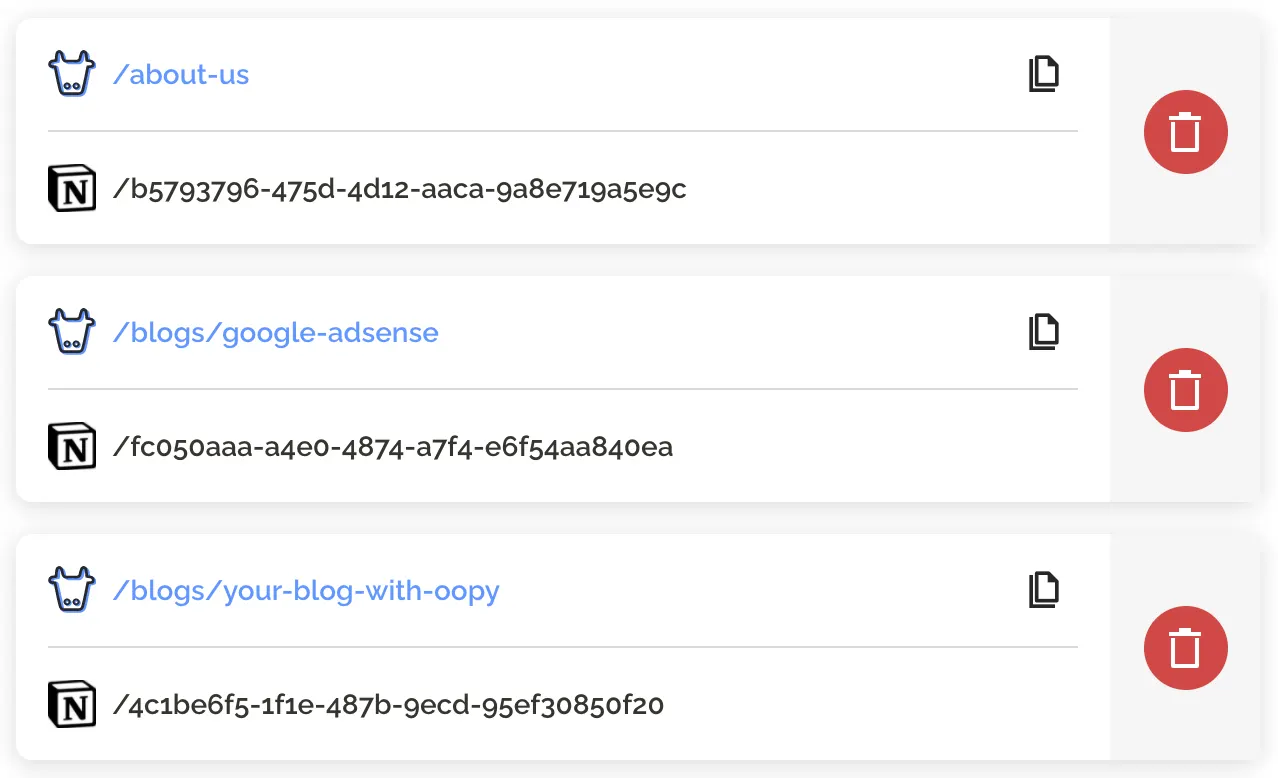 Oopy 와 연결된 노션 페이지(즉, 루트 페이지)에는 클린 URL 을 설정할 수 없습니다.