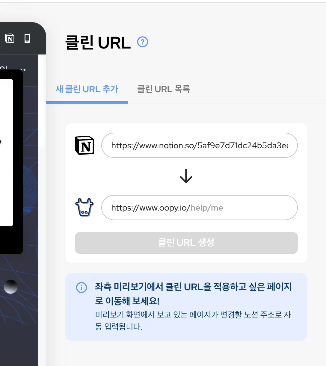 노션 아이콘이 있는 주소창에, 위의 oopy:hide 에 숨긴 노션 페이지의 ‘웹 게시용 주소’를 입력해주세요.